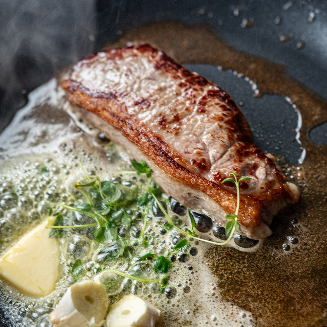 Tilsett smør og eventuelt smakstilsetninger når det gjenstår 1 minutt av steketiden.
